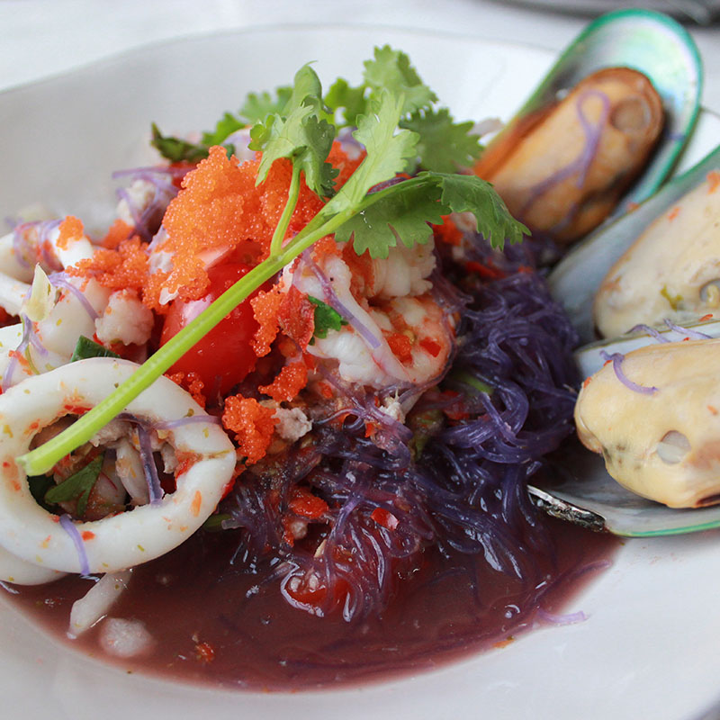 Surprisingly amazed by the distinguishably creative dish, Spicy Butterfly Pea Vermicelli Salad, this dish is highlighted by its enticing lavender shade of sticky vermicelli served with the fresh seafood including squids, shrimps, big New Zealand mussels, and topped with shrimp’s eggs. This combination makes an absolutely matchable flavor. Not only does it look yummy, but it also wakes up your taste buds by its fantastically delicious spicy taste.