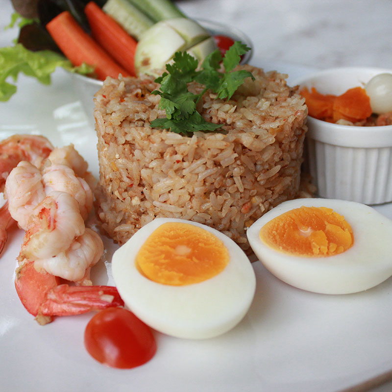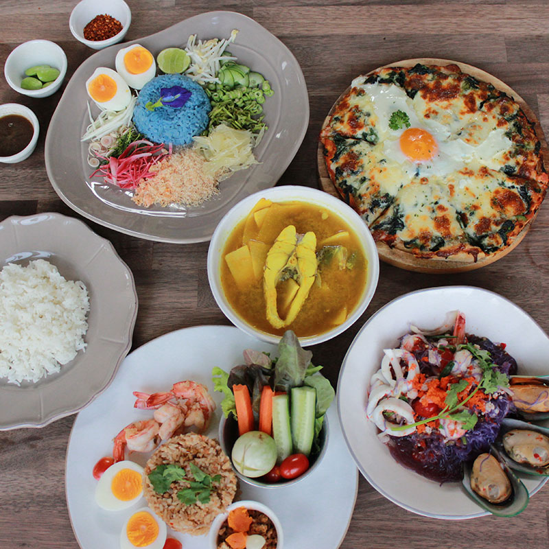 Colorful veggie-filled dishes parade served with 100% Thai Fragrant Jasmine Rice from Khao Tra Chat Thong, AKART Spicy Rice Salad with Vegetables is one of the recommended dishes in this restaurant. While presenting its vibrant purple rain authentic color in charming rice, this dish maintains its high portion of beneficial nutrition and herbs. Soaking the rice with the special spicy Budu salad sauce creates a highly delectable taste.