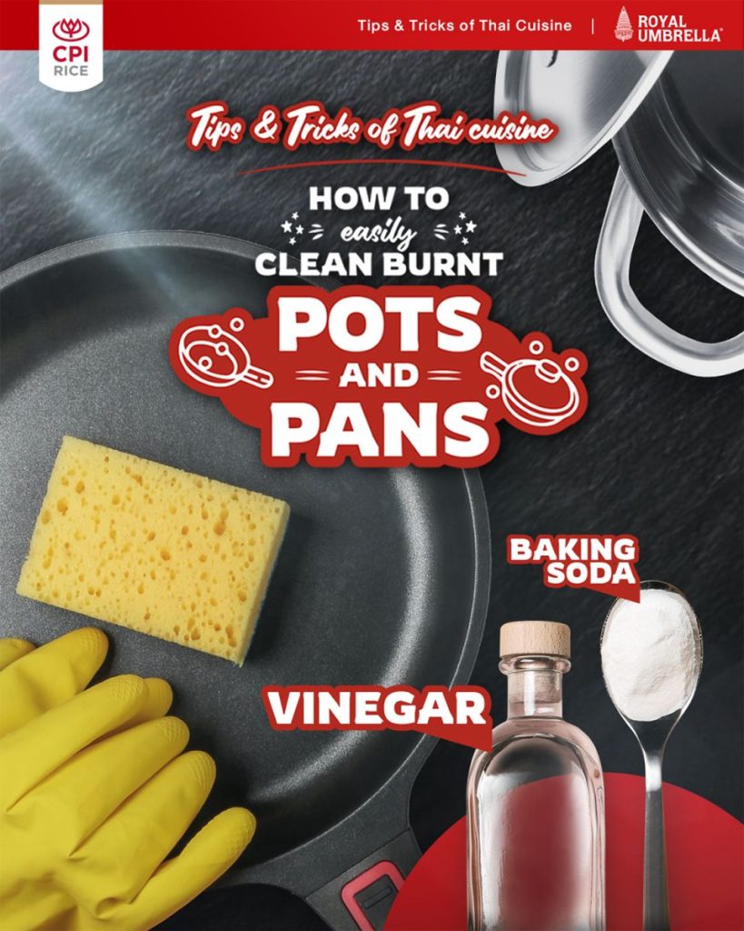 Because who has time to soak a pot overnight, right? Simply combine baking soda and vinegar to make a thick paste and pour the solution into the pot/pan. Gently scrub it with a sponge and let the pan soak for 10 minutes (or even a few hours, depending on the stain). Wash the pan with a scrubbing brush, then rinse.