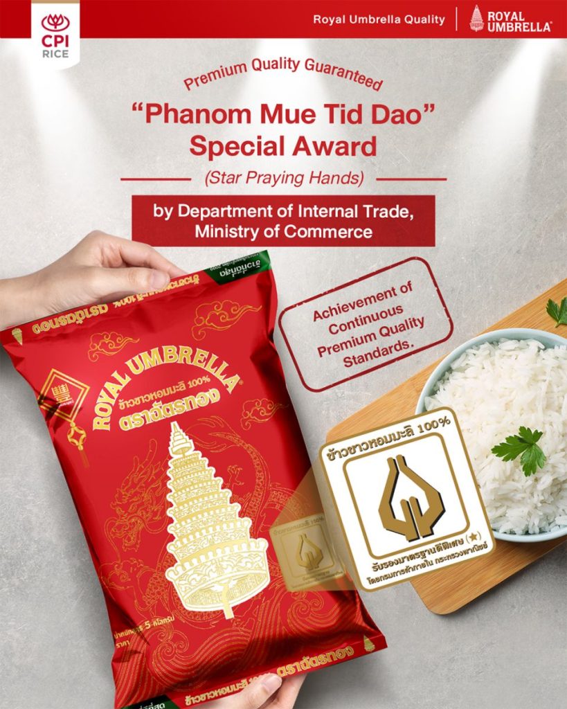 Royal Umbrella is more than proud to have received “Phanom Mue Tid Dao” special award from the Department of Internal Trade – Ministry of Commerce, as a recognition and approval of being able to continuously maintain our best quality standards of Thai jasmine rice 100% for 4 consecutive years! (2016-2019)